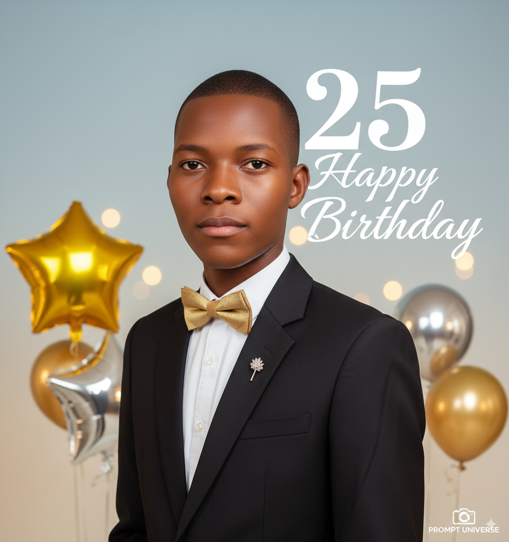 Transform the provided photo into a professional studio photoshoot for a birthday. Keep the person’s exact face details, body shape, age, and natural features unchanged. Dress them in a stylish and festive outfit (e.g., elegant dress or modern suit depending on gender). Place them in a professional photography studio environment with a clean, neutral background (soft gradient, black, or pastel colors). Use premium studio lighting (softbox, balanced diffusion) to create a polished high-end look. Subtly add refined birthday elements in the background (gold/silver balloons, soft lights, birthday numbers or “Happy Birthday” text). logo of Studio « ENAGNON DIGI SERVICES ». Style: ultra-realistic, HD, professional studio photography, sharp details, elegant and festive atmosphere.