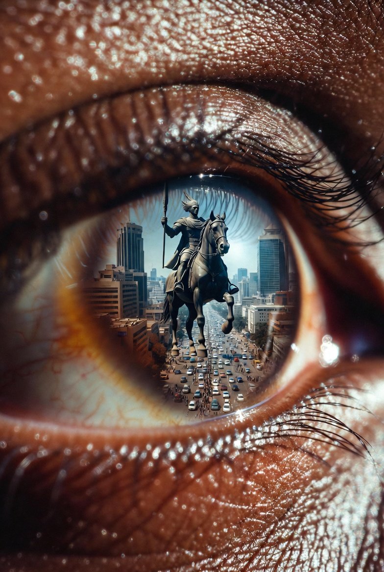 Ultra gros plan d’un œil humain africain, texture de peau très réaliste, cils nets et détaillés.\ Dans la pupille, une scène surréaliste hyperréaliste montrant une immense statue équestre (guerrier ou roi africain à cheval, brandissant une lance), dominant une grande ville moderne africaine avec des gratte-ciels, des routes animées et des voitures.\ Reflet parfaitement intégré à l’œil, perspective cinématographique, profondeur de champ naturelle.\ Éclairage dramatique, contraste élevé, couleurs réalistes, ambiance épique et symbolique.\ Style photographie + art conceptuel, ultra-détaillé, 8K, sharp focus, sans texte, sans watermark.