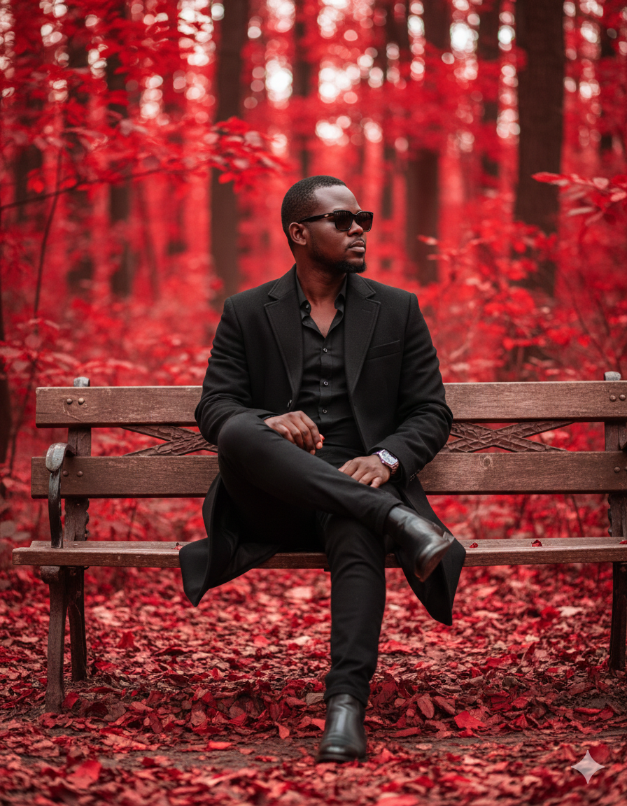 A hyper-realistic 8k vertical composition capturing a person seated on a rustic wooden park bench within a vibrant autumn forest. The person, with an uploaded face as reference, is elegantly dressed in a sophisticated all-black outfit: a long, tailored black overcoat, a black button-up shirt with an open collar, black slim-fit trousers, and polished black leather Chelsea boots. They are accessorized with stylish black sunglasses and a silver-toned wristwatch on their left wrist. The subject is posed casually with their right leg crossed over their left, their gaze directed thoughtfully towards the right side of the frame, creating a sense of contemplation. The camera employs a slightly low-angle perspective, framing the subject slightly off-center to the left, allowing for a balanced composition with negative space above. The background is a breathtaking expanse of a dense forest, where all the trees are adorned with intensely vibrant, deep red and maroon autumn leaves, mirroring the thick carpet of fallen leaves covering the entire ground. This creates a striking, almost monochromatic red environment that contrasts sharply with the subject’s attire. The scene is illuminated by soft, diffused natural light, producing cinematic lighting with subtle rim lighting on the subject’s hair and shoulders, and a warm, ambient glow reflecting from the rich red foliage. A medium telephoto lens is used to achieve a shallow depth of field, rendering the background leaves into a beautiful, ethereal bokeh of soft, glowing red orbs. The wooden bench exhibits highly detailed texture and intricate carved patterns on its backrest, while the ground’s blanket of crisp red leaves adds another layer of highly detailed texture to the hyper-realistic scene.