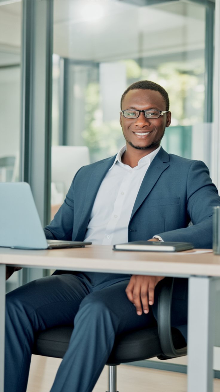 « Professional portrait of a man sitting at a modern office desk, wearing his glasses, natural daylight from a large window, soft shadows, elegant business attire, confident and relaxed posture, clean corporate background with laptop and minimalistic décor, ultra-realistic photography, 50mm lens, high detail, crisp focus, warm and professional atmosphere.