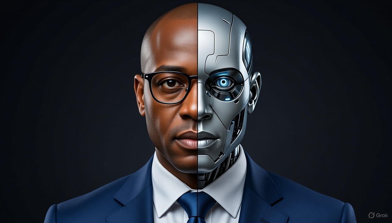 Portrait réaliste basé sur la photo fournie, cadrage buste ou visage. Visage divisé verticalement en deux parties parfaitement alignées : – Côté gauche : visage humain réel, identique à la photo (peau naturelle, pores, expression authentique). – Côté droit : version robotique futuriste du même visage, structure mécanique visible, métal lisse, circuits lumineux subtils, yeux cybernétiques. Cohérence parfaite des traits du visage entre humain et robot. Éclairage cinématographique dramatique, fond sombre ou minimaliste. Style hyperréaliste, ultra détaillé, 8K, high contrast, sharp focus. Aucune déformation, pas de caricature, pas de plastic skin, sans texte, sans watermark.
