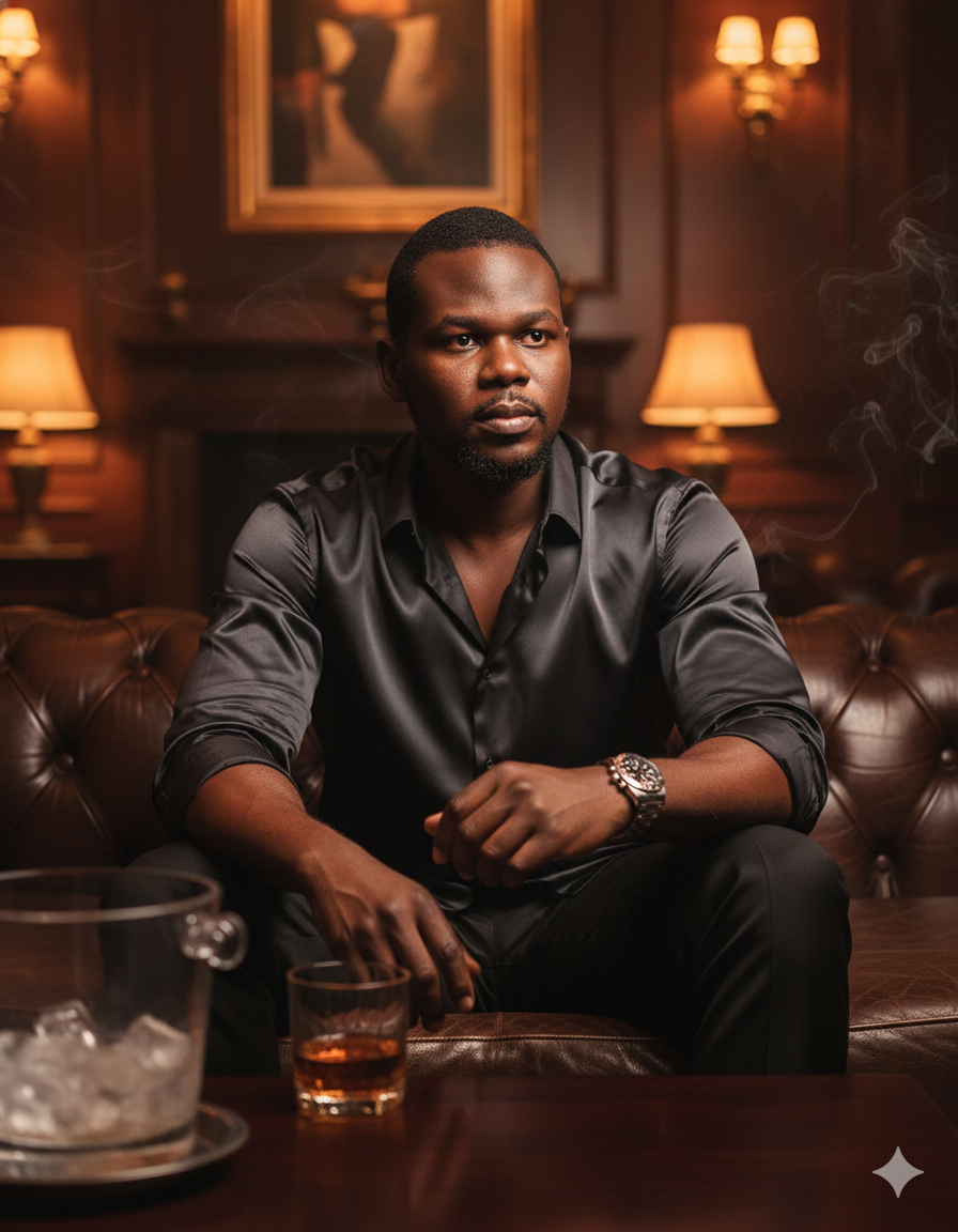 A hyper detailed cinematic scene featuring use uploaded face 100% as reference as a formidable presence at rest. The camera captures the hero in the center of the frame with absolute clarity and dramatic presence. He wears a dark, unbuttoned silk shirt, its fluid drape and soft sheen apparent, sleeves rolled up, revealing muscular forearms and an expensive watch. He is seated on a plush leather sofa in a dimly lit private lounge, a half-empty glass of whisky on the table, his posture relaxed but his eyes alert and observant. heavy atmosphere with rich, amber mood lighting. Use language inspired by premium photography and expert level photo manipulation techniques similar to high end Photoshop to achieve top quality realism without CGI or 3D graphics. Create a one of a kind, unforgettable scene with unmatched detail, cinematic power, and full focus on the hero. no CGI or 3D graphics or art. use Photoshop manipulation if the scene illogical and imaginary.